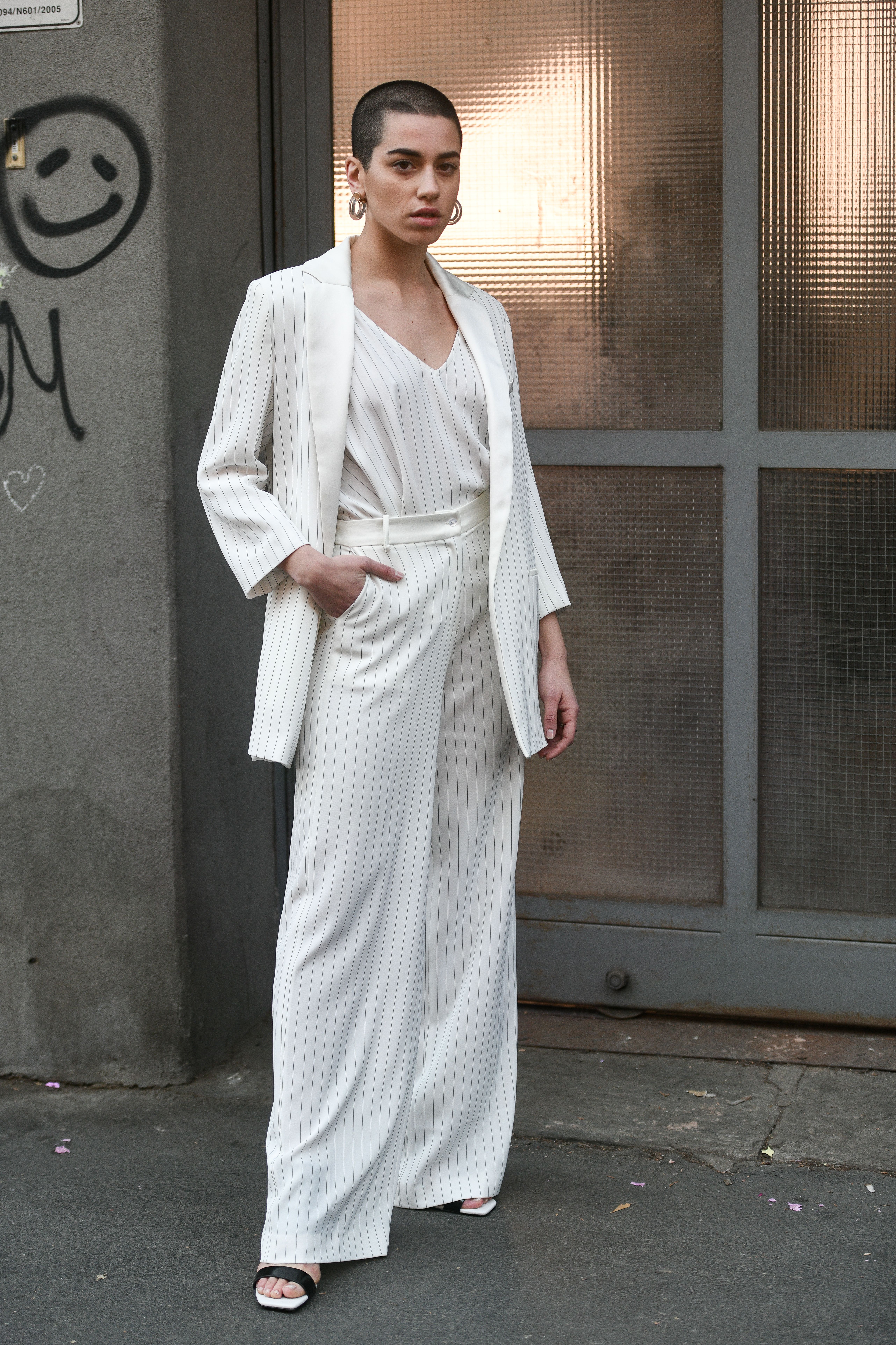 A guest stuns in head-to-toe white outside Milan Fashion Week.