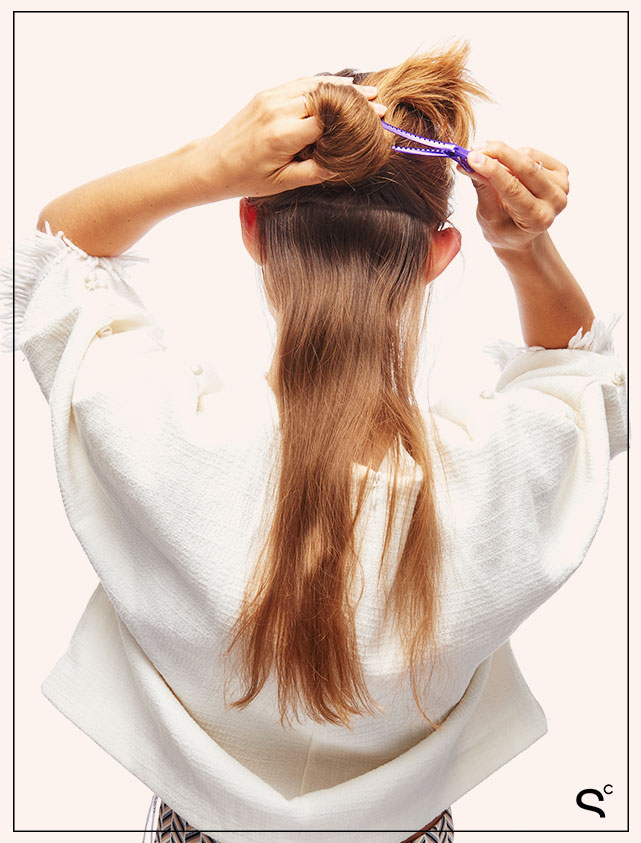 1. This style is best created with day-old or slightly dirty hair. Spray with a heat protectant that also has some hold to it.