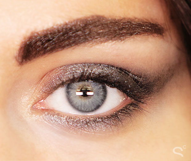 Naked Smoky gives you three perfect silver/gray tones to create a quintessential smoky look. Without going too hard on the smoke, opting to play with texture instead, we ombré’d Slanted, a metallic gunmetal gray into Dagger, the deeper gray with a slight shimmer. Dagger was blended into a dramatic but soft wing shape going outwards, and swooped down to line the lower lashes. We dabbed more of Slanted onto the center of the eyelid as well as the center of the lower lash line to give the look a bit of metallic dimension. When you apply light-reflecting shimmer and gloss to the area of the eye that protrudes the furthest out (like the center of the eyelid) it makes your eyes appear rounder and deeper by dimension.