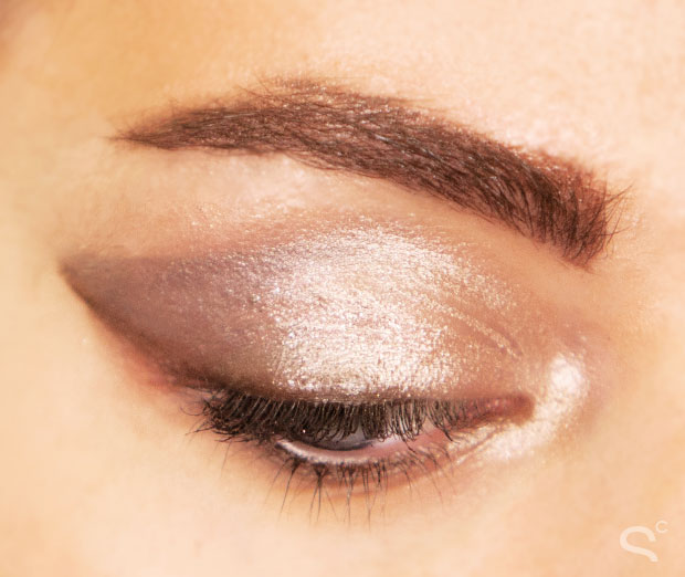 A smoky cat eye is a must with this palette. With a glitter-speckled iridescent cool bronze (or warm silver, depending on how you look at it) shadow like Armor, this takes the classic smudged cat-eye to a new years eve party. Combust, the matte pale rose color was dusted on the entire lid, with Armor blended into the crease and extended into a pointed shape, defining the outer eye corner. Black Market, the deep shimmery black shade, was painted along the lash lines with a flat eyeliner brush and winged out in the outer corners for a smoky cat eye effect.