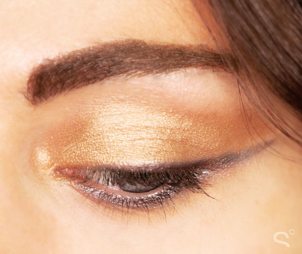 Gold is a flattering shade on most women, and you get three gold and bronze shades in this palette. Brushing the palest gold, Dirtysweet, all over the lid and in the inner corners, we blended medium bronze shade, Radar, from the middle to the outer corner of the eye. Lastly, Whiskey was used again to line the lashes, slightly winging out at the corner for a soft cat-eye.