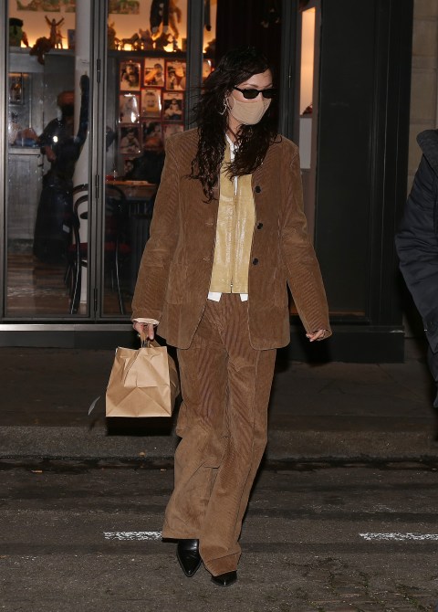 Jokes aside, besides the color, there’s nothing ~shitty~ about this outfit at all. If anything, it’s giving me hot chocolate bomb realness! Hadid stepped out during Paris Fashion Week in some dark shades, a SKIMS face mask in shade Clay, black pointy-toed boots and oh, yeah, a full-on brown corduroy suit. The suit’s oversized silhouette featured simple black buttons and the star paired it over what appears to be a tan leather vest (Or maybe a thin jacket?) and a white button-down beneath that.