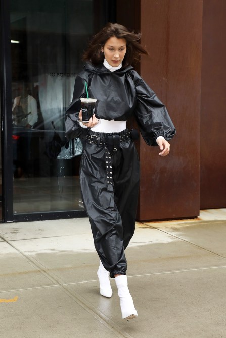 Bella’s look involved a cropped black raincoat with seriously puffy sleeves, matching black harem pants, sleek white heeled ankle boots, a white turtleneck undershirt and an embellished, low-hanging black belt. Warm? Check. Chic? Check. Waterproof? Mostly. Plus, the raincoat comes with a hood Hadid could put up to protect her carefully coiffed mane.