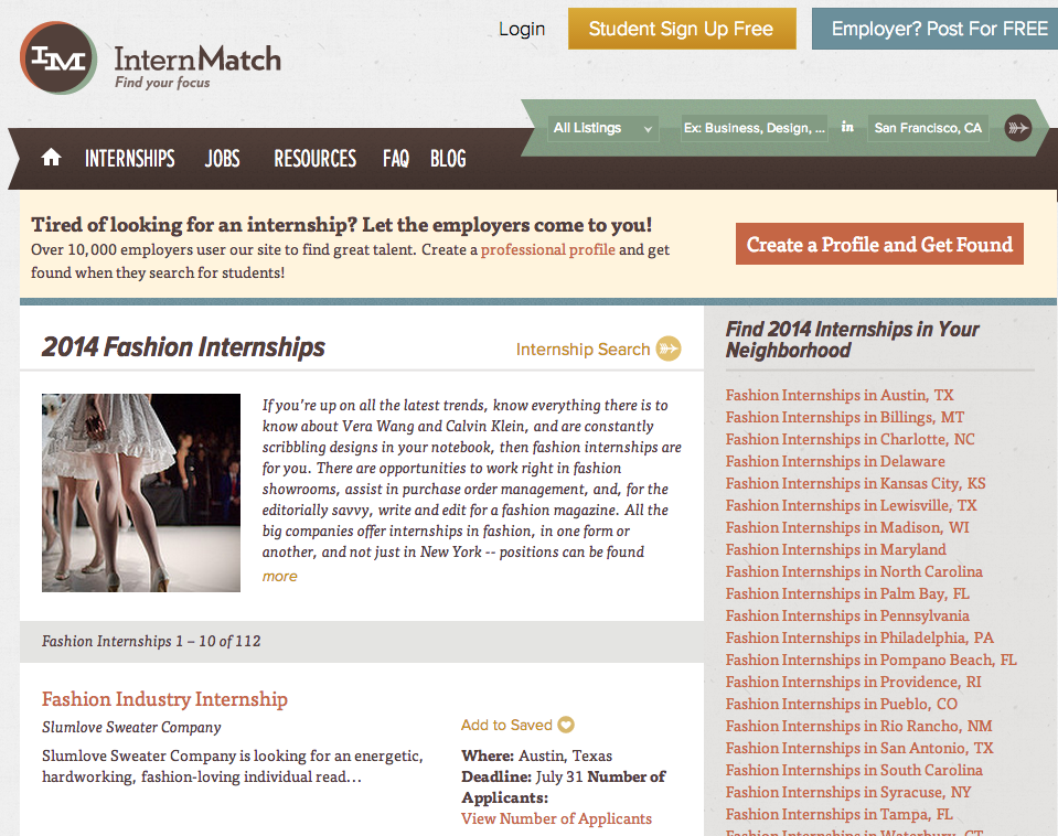 Free Fashion Internships offers just what it claims—fashion internship postings for free. While you can sign in through Facebook or Twitter and apply to one internships for free, after the first free application, you have to pay per application. But, on the plus side, FFI offers all the best names in the fashion industry from showrooms to designers to fashion websites. There’s really something for everyone here.