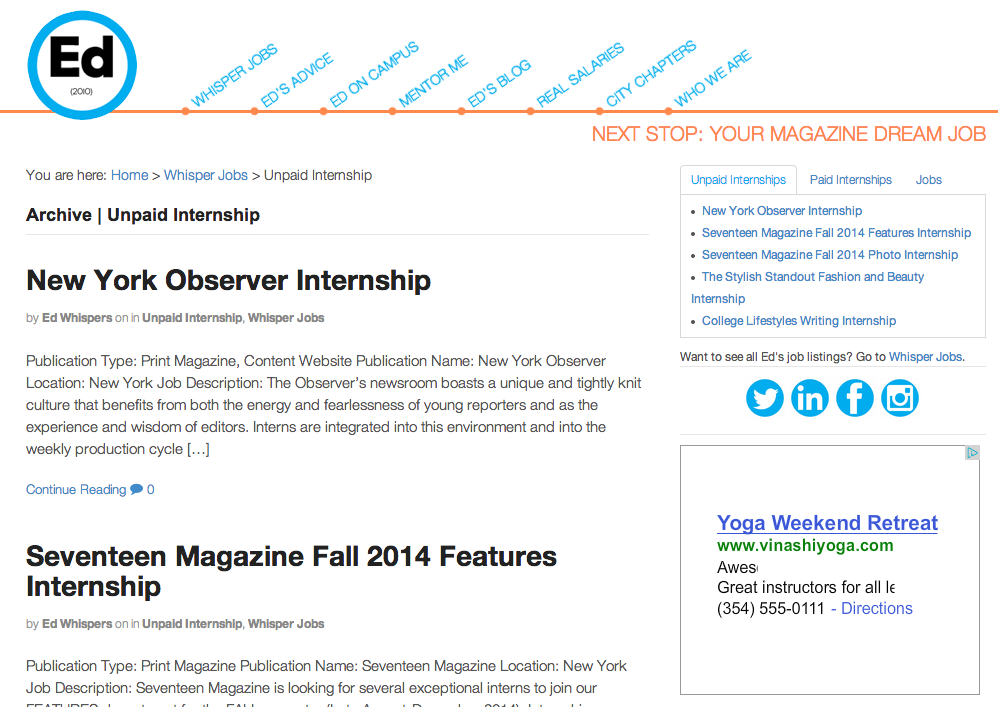 Ed2010 is perfect for the student who is looking for a fashion journalism internship. Whether it’s writing, working in the fashion closet of a magazine or being a photo intern at Vogue, you’ll be able to find any magazine or digital magazine’s internship postings on Ed2010. They are also organized by “unpaid”, “paid” or “jobs”—making it easy on you to find exactly what you’re looking for.