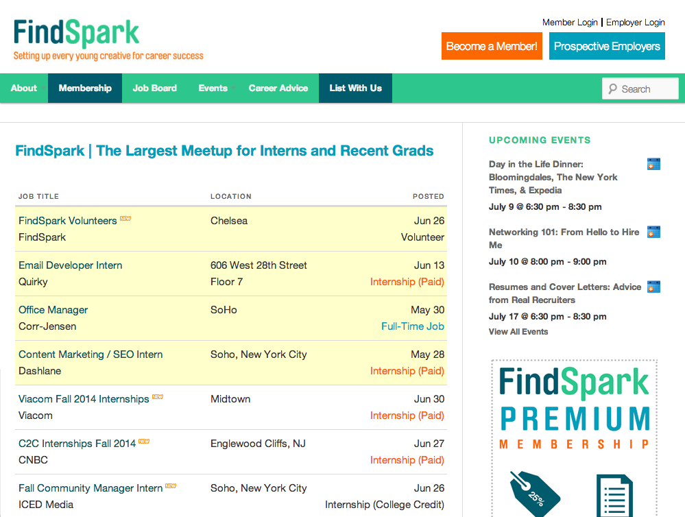 FindSpark is the perfect place for young creatives. You can find many job and internship postings as well as event dates where you can meet with other young entrepreneurs to network—which, by the way, is a great way to find an internship. The site also offers career advice for those of you seeking it.