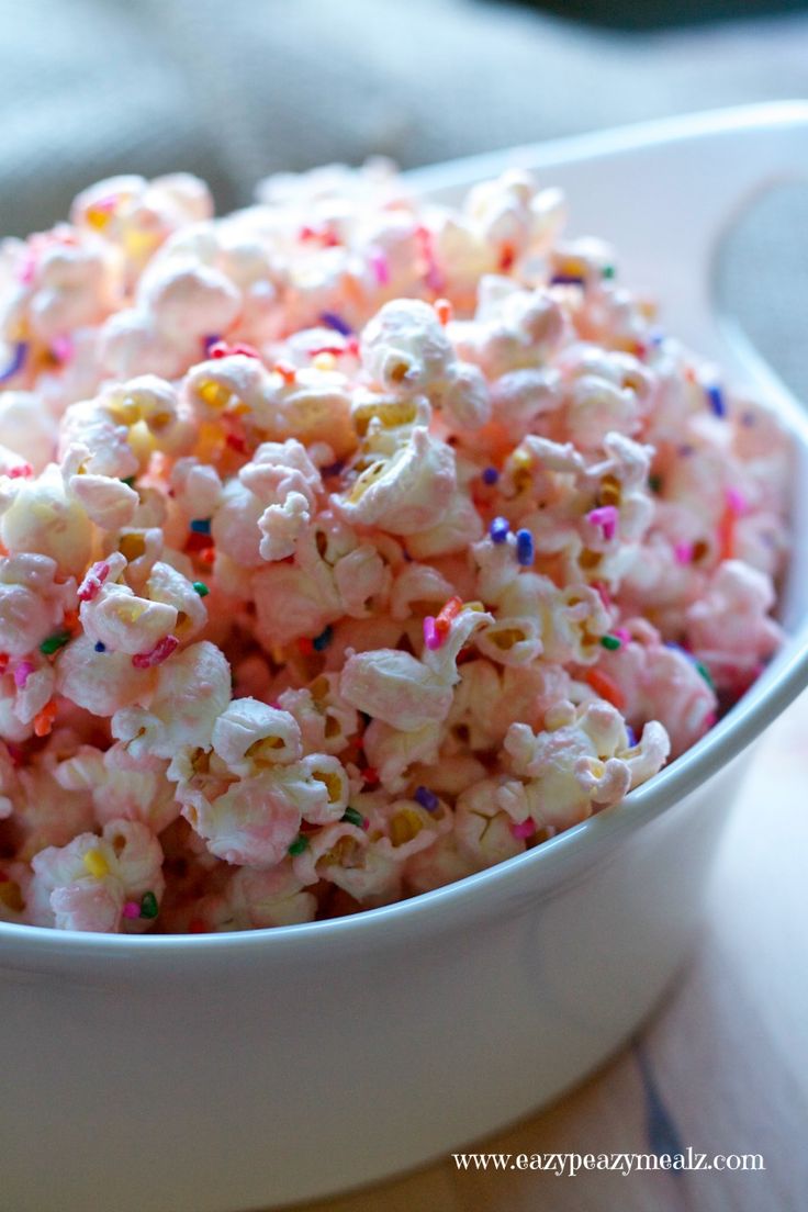 3. Trust us, you’re never too old for colored popcorn. The above version uses only three ingredients: Popcorn, vanilla candy, sprinkles.