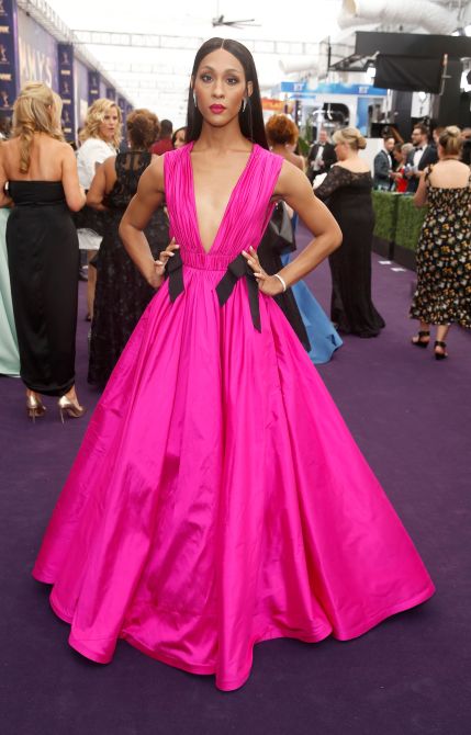 Actress Indya Moore stunned in a white Grecian inspired gown. Her groundbreaking series Pose is nominated for an Outstanding Drama Series.