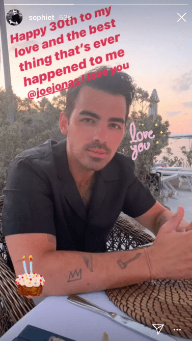 Turner shared a sunset photo of her new hubby—what is it about sunsets? The lighting is always perfect—and Jonas looks pretty cute. The Insta story features a really cute caption, “Happy 30th to my love and the best thing that’s ever happened to me @joejonas I love you.” Aww! Simple. Understated. But moving AF. The Game of Thrones actress also included a gif of the words “love you” complete with little stars. And a second gif of a cupcake with two candles in it.