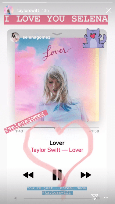 Though they probably haven’t seen much of each other–that doesn’t mean that these ladies aren’t tight AF. Recently the “Wolves” singer hopped on Instagram to praise her fellow songstress bestie on the release of Lover. She captioned the photo, “You’re just …unreal dude @taylorswift13.” She also drew a massive pink heart over the album’s title track.