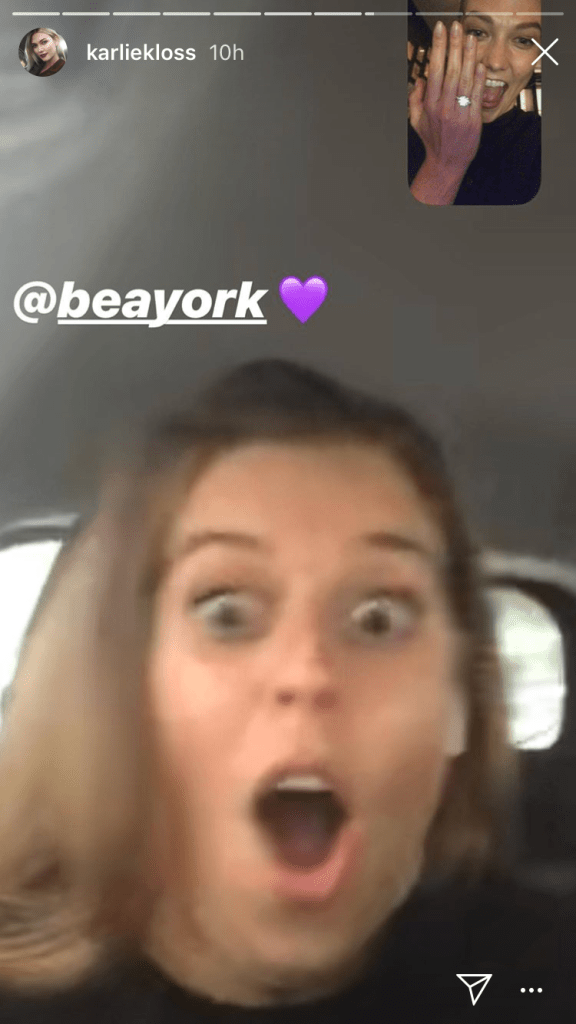 On Tuesday, the 25-year-old model announced her engagement to businessman Joshua Kushner (brother to Jared Kushner and brother-in-law to Ivanka Trump.) To keep the happy theme going, Kloss also shared screenshots from FaceTime calls with several of her celebrity friends to let them know that she was engaged. “One of the best parts 💍💍💍💍…” Kloss wrote on a slide on her Instagram story before sharing screenshots from her FaceTime calls with celebrities, such as Serena Williams and Princess Beatrice. (Side note: Kloss also exposed Princess Beatrice’s secret Instagram—it’s against tradition for royals to have social media—so it was an eventful day.)