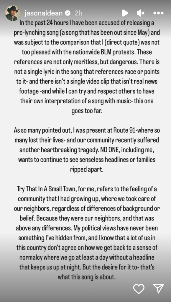 What is the meaning of Jason Aldean‘s “Try That In A Small Town?” lyircs? Aldean posted on his Instagram stories, “In the past 24 hours I have been accused of releasing a pro-lynching song (a song that has been out since May) and was subject to the comparison that I (direct quote) was not too pleased with the nationwide BLM protests. These references are not only meritless, but dangerous. There is not a single lyric in the song that references race or points to it – and there isn’t a single clip that isn’t real news footage – and while I can try and respect others to have their own interpretation of a song with music – this one goes too far,” wrote Aldean, going on to reference the 2017 Las Vegas festival mass shooting.