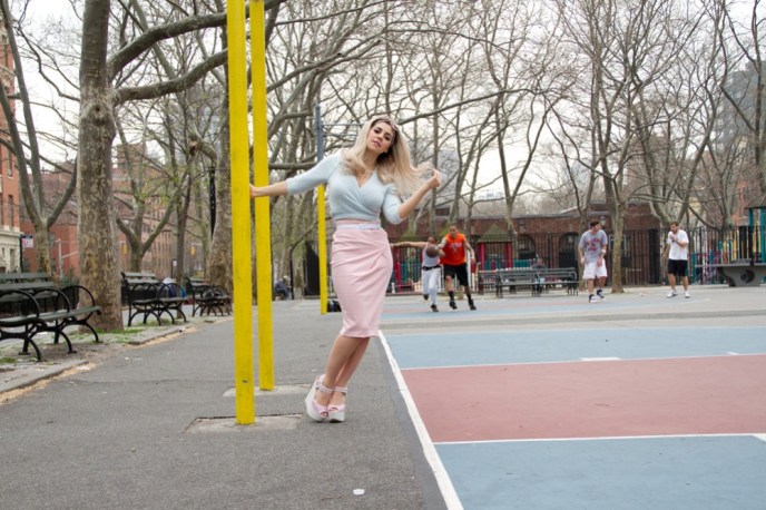 M: Yeah [laughs], with blonde hair they do, definitely. Definitely. From what I see in magazines and stuff, I think neons are coming back quite a lot, very bright colors for summer, but I don’t, I don’t know…I felt the first album was so pop art and really brash that I’ve kind of stepped away from that so I’ll probably be sticking to very soft, feminine colors.