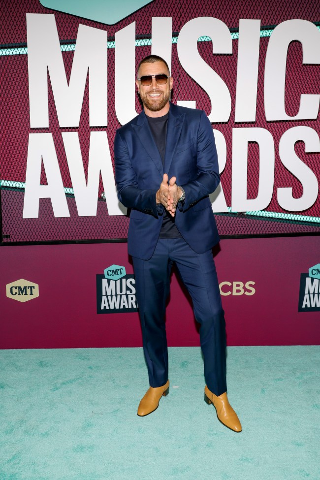 Wearing a classic navy suit at the 2023 CMT Music Awards.