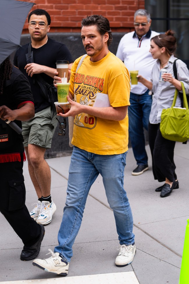 Last week, Pedro Pascal was seen in New York City filming Materialists. His outfit was pretty simple: light-wash jeans paired with a vintage Lakers tee. And his New Balance 550s tied the look together perfectly. Wearing a T-shirt with jeans is a no-brainer combination, and Pascal’s sneakers offered the perfect way to elevate the classic look.