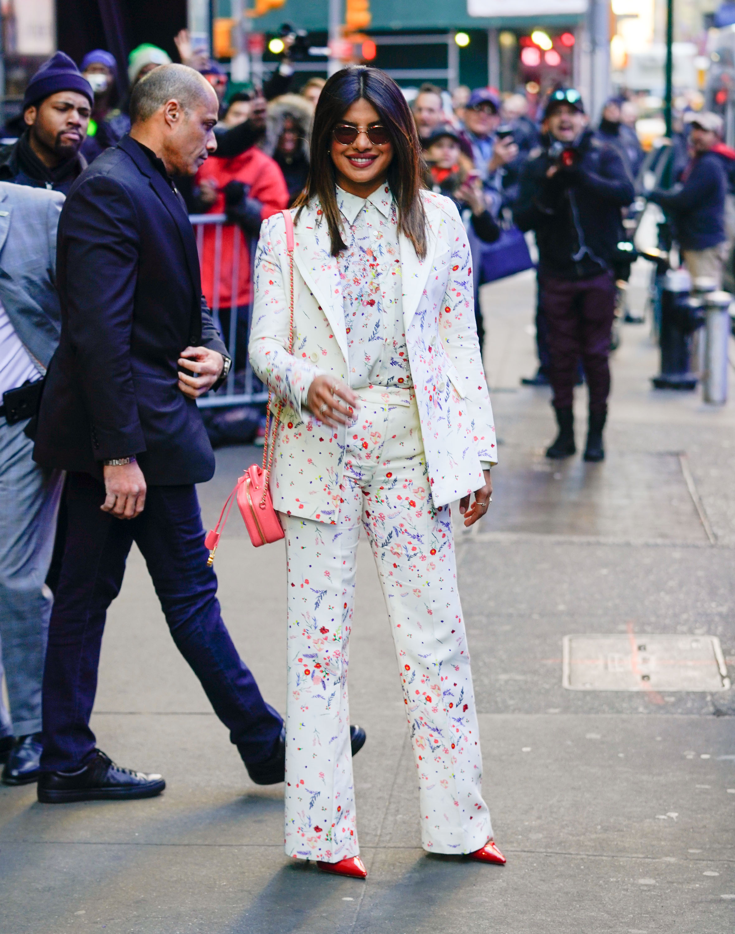 The actress stepped out in New York sporting a three-piece paint-splattered floral suit that really reminded us all that spring will eventually arrive. The white suit was covered in tiny red and purple flowers, along with multi-colored details that, from afar, just look like tiny paint splatters. It’s hard to tell whether or not the pattern on the outfit has any sort of intentional structure, leaving me to assume Priyanka Chopra bought a white suit and decided to paint all over it. I mean, we all have our hobbies.