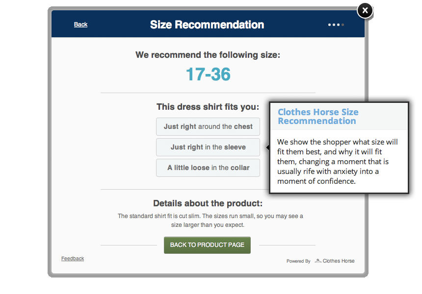 Basically, it’s a tool that will be on over 600 e-commerce sites that allows shoppers to click on a “What size am I?” button. From there, you’ll be brought to a quick (and we really mean quick! It takes about 20 seconds!) pop-out Clothes Horse survey with basic questions about your size. The pop-out will then do it’s job to calculate the perfect size for you in a specific brand, instead of you having to consult a generic size chart.