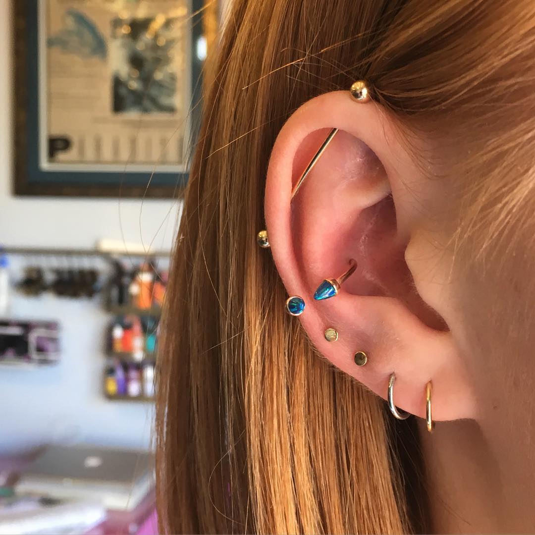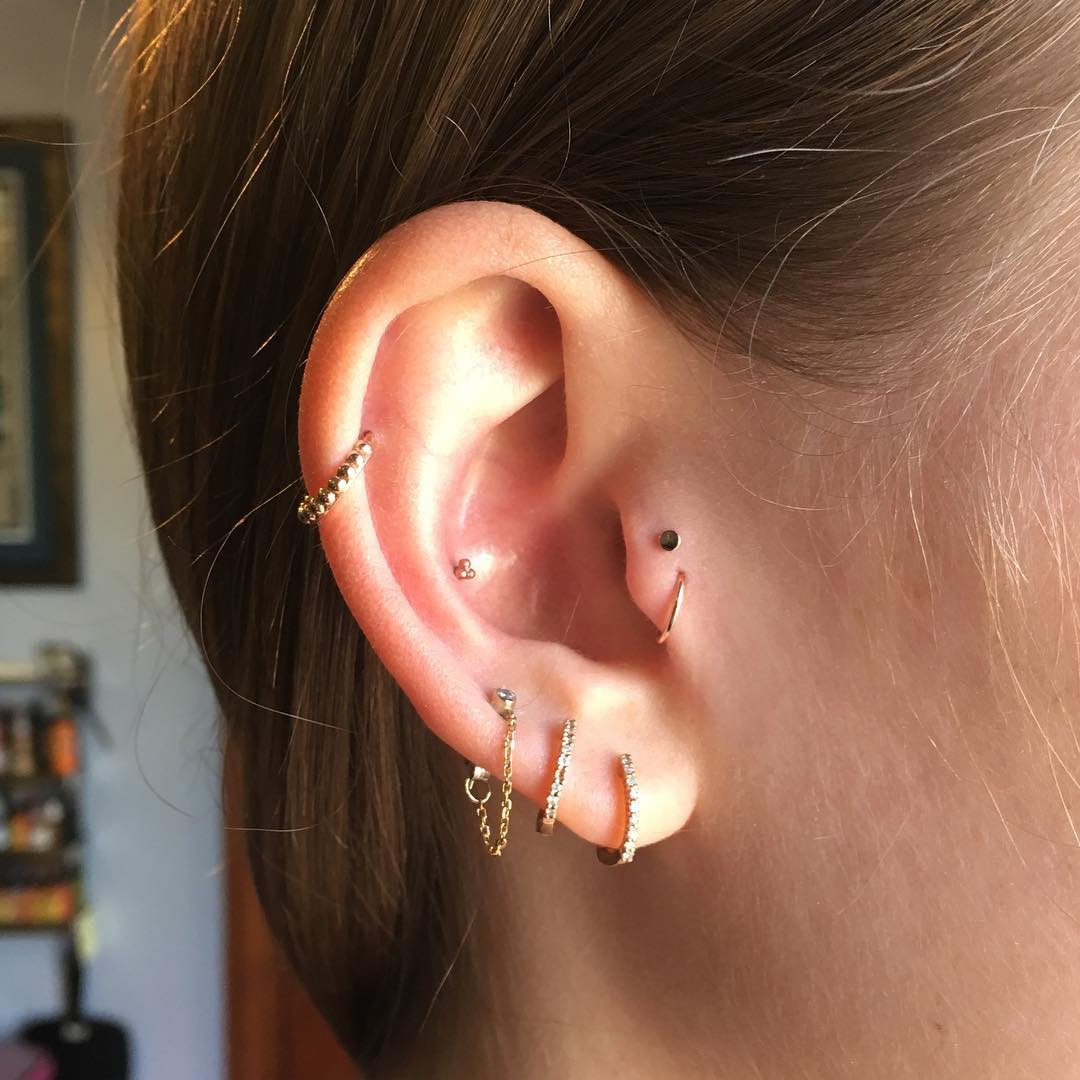 On a less clinical note, the options for jewelry have also expanded significantly in recent years alongside the mainstreaming of piercing itself, with yellow gold arrows supplementing the standard barbells for industrial piercings, and gemstone-laden hoops adding a touch of femininity to once-tough piercings like the snug and rook.