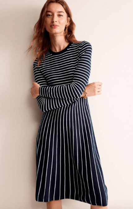 Why wear a sweater when you can wear a sweater dress? This knit midi from Boden features a sailor-stripe top with a vertical stripe skirt and the combo together screams fall. It’s perfect for transitional weather when you can still show a little leg. When it gets colder, you can pair it with knee-high leather boots for added warmth. Plus from September 10-16, 2023, you can score 25 percent off full price items with the code T4W6.