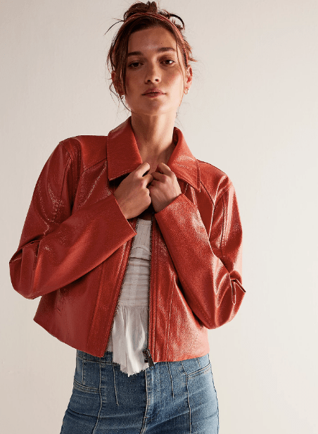 This red leather jacket is the ultimate layering piece. Wear it over a girly blouse, a simple black turtleneck or a mesh long sleeve. It’ll look great with maxi skirts, wide-leg trousers, and baggy jeans.