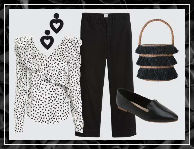 Shop the look: High Rise Wide-Leg Crop Chinos in Black, $59.95 at Gap; Self Portrait Dotted Ruffle Blouse, $310 at Intermix; Mini Lolita bag, $145 at Kayu; Beaded Heart Drop Earrings, $42 at Shopbop; Leather Pointy Loafers, $59.95 at Gap.