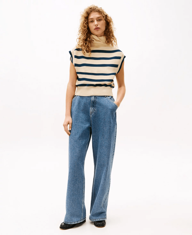 This nautical ribbed sweater tank is begging to be taken on a yacht, on a coastal vacation somewhere in Europe, and somewhere warm. Made of a more delicate lyocell-silk blend, this soft top must be dry-cleaned only.