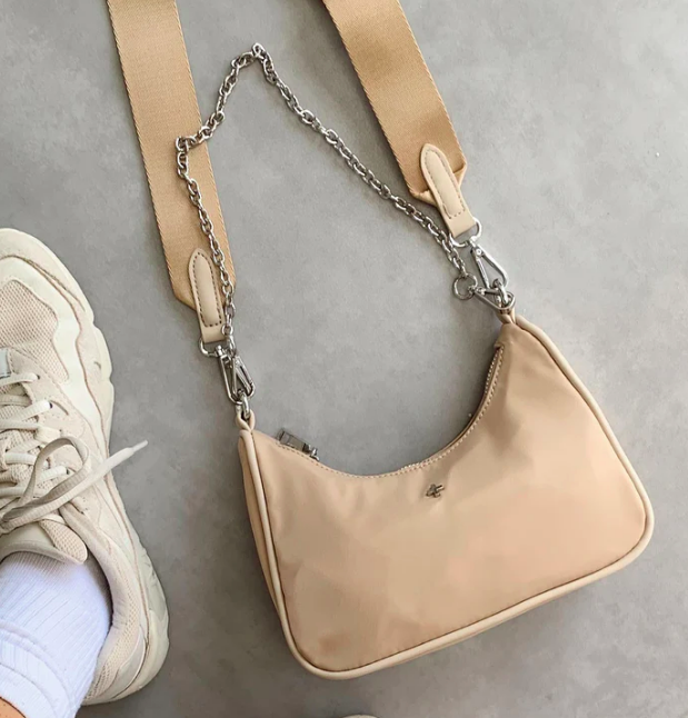 This nylon bag is so close to Prada’s iconic nylon option. It even has the thick shoulder strap that’s detachable and the chain strap when you want to wear it as a mini.