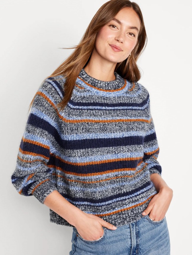 If you told me you paid $300 for this striped design, I’d believe you. The cool combination of bright and darker stripes feels expensive to me, and I could easily envision this being styled with wide-leg trousers and heeled boots for a cute yet cozy look.