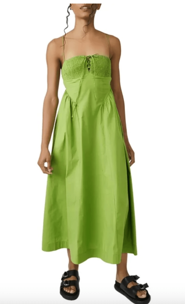 I love how the model is styled with chunky sandals because whether you go the Birkenstock route with these or even Doc Martens leather sandals, the black chunky contrast to the feminine green dress is *chefs kiss* in our eyes. It adds just a bit of edge to a gorgeous dress that comes in three different colors.