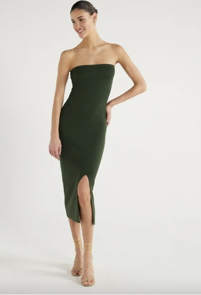 This strapless midi dress is the perfect complement to your slicked back Hailey Bieber-esque bun. This can be a simple wedding guest look or a date night stunner. We love a dress that has range, and this $29 option gives us just that. It’s available in both green and black.