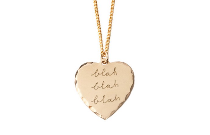 Engraved with cheeky sayings and zeitgeisty references like Beyoncé‘s “I woke up like this” or Taylor‘s “Haters gonna hate,” these $40 heart-shaped pendants come in brass (though you can get them custom-made in gold or silver) on your choice of an 18- or a 24-inch plated chain.
