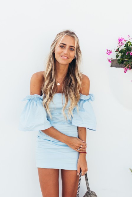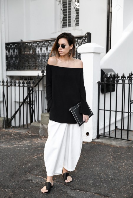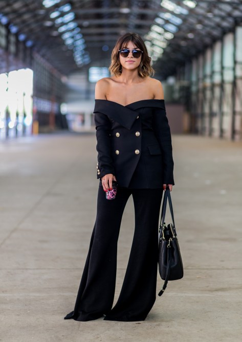 SYDNEY, AUSTRALIA – MAY 16: Marissa Karagiorgos wearing a off shoulder blazer jacket and black wide pants outside Ginger & Smart at Mercedes-Benz Fashion Week Resort 17 Collections at Carriageworks on May 16, 2016 in Sydney, Australia. (Photo by Christian Vierig/WireImage)