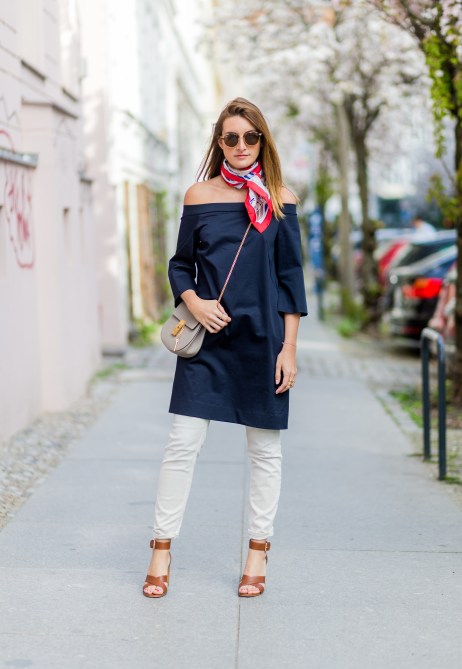BERLIN, GERMANY – APRIL 24: Sofia Grau is wearing white Closed jeans, a navy COS dress with long sleeves, a red white Chanel scarf, Rayban sunglasses, brown sandals with heels from &otherstories, a grey Chloe Drew Mini Calfskin Leather Shoulder Bag chloe drew bag on April 24, 2016 in Berlin, Germany (Photo by Christian Vierig/Getty Images)