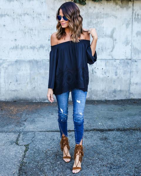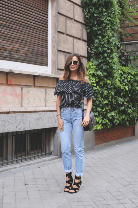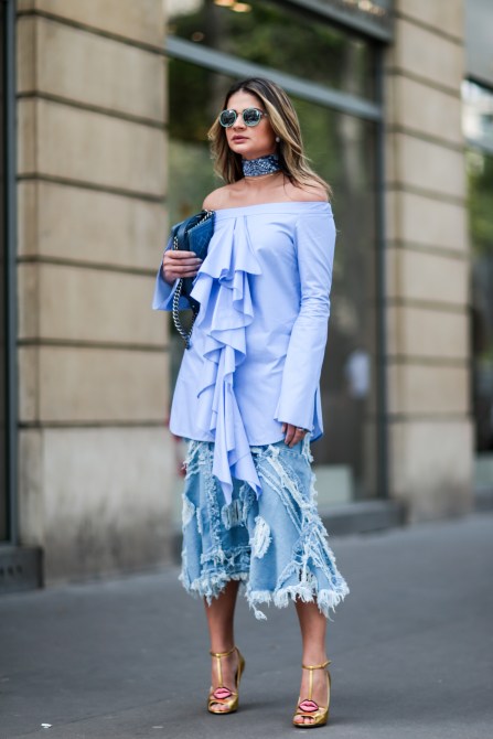 NEW YORK, NY – SEPTEMBER 13: Guest is seen on the streets of Manhattan outside of the Rachel Zoe Spring 2016 fashion show at Skylight at Clarkson Sq wearing Johanna Ortiz white high waisted pants and off the shoulder blue and white top on September 13, 2015 in New York City. (Photo by Georgie Wileman/Getty Images)