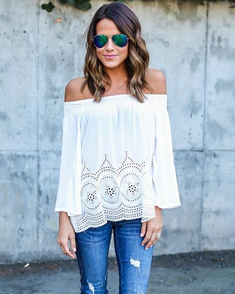 NEW YORK, NY – MARCH 16: Gillian Del Zotto wearing ripped J Brand Jeans, white lace Nightcap Clothing top, white leather Jeffrey Campbell shoes with tassels, black and white Valentino bag with studded detail and gold chain and oversized white Thierry Lasry sunglasses on March 16, 2016 in New York City. (Photo by Georgie Hunter/Getty Images)