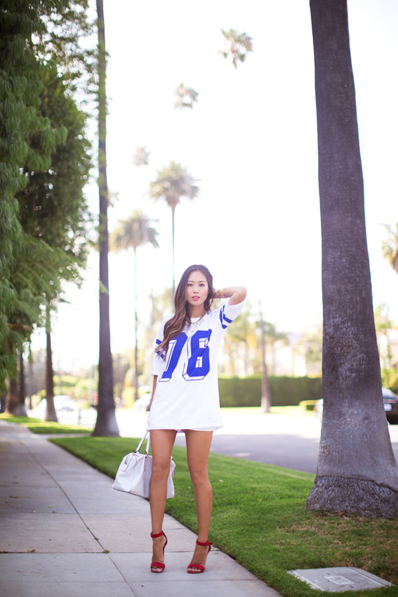 Sports jerseys scream casual, which is why it is so fun to switch things up and dress them up with ladylike high heels and a killer statement bag.