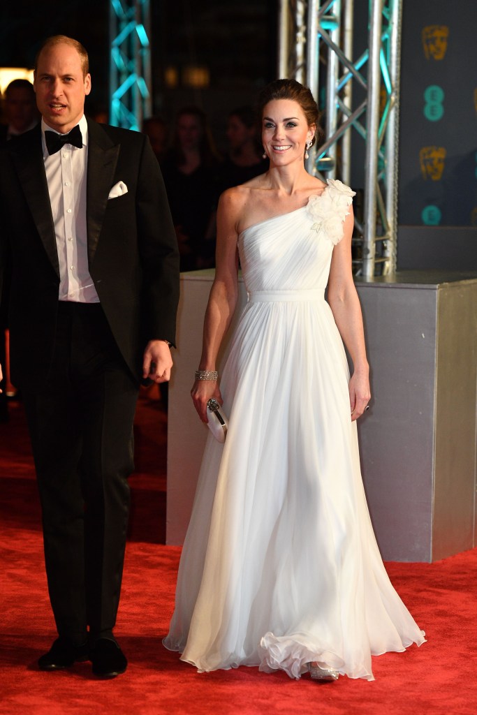 Middleton and her royal husband, Prince William, hit the red carpet at the 72nd British Academy Film Awards last night for their third year in a row. Middleton wore an asymmetrical Alexander McQueen white gown with floral decorations on her left shoulder. She paired the striking dress with a white clutch, a sparkling diamond bracelet and a pair of her late mother-in-law’s pearl and silver earrings. They were the perfect addition to Middleton’s simple yet elegant look and a wonderful way to honor Prince William’s mother. Princess Diana wore the same earrings in 1995 when she accepted the Humanitarian of the Year Award from the United Cerebral Palsy Foundation.