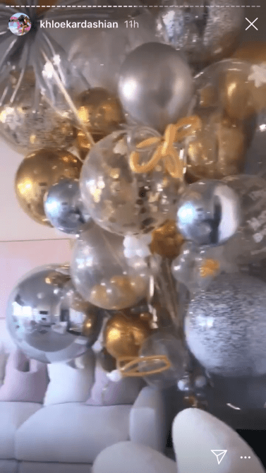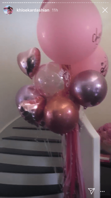 To celebrate her big day, Khloé wore a pink corset (she had to match the decor) along with her diamond choker which spelled out “True” on it. Kylie obviously spent a ton of time on the decor for the venue. She had flowers and balloons strung up all around the party. Though the flowers were all pink–the balloons were an assortment of pinks, golds, and silvers. There was even a neon pink sign that read “Khlomoney.”