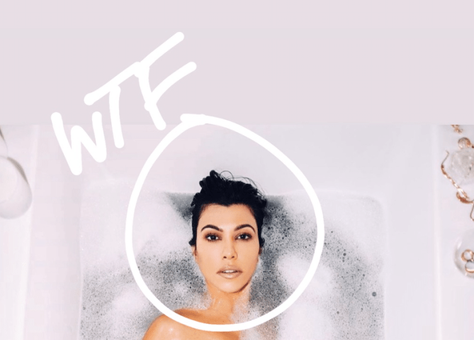 On Monday, Kourtney took to Instagram to share a photo of herself in a bubble bath. “Love yourself as deeply as you love them,” the reality star wrote. But the sentiment wasn’t what her 75 million followers were paying attention to—it was the obvious photoshopping. Fans have been all over this latest post asking what the heck is up with the photoshopping that looks like her kids could’ve done it for her. (Honestly, Mason probably could have done a better job).