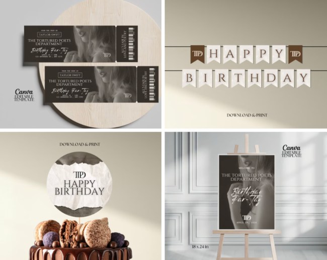 It’s not a true Taylor Swift themed party without a sprinkle of TTPD. Grab this birthday bundle that includes a banner, cake topper, concert ticket inspired invitations and a welcome sign.