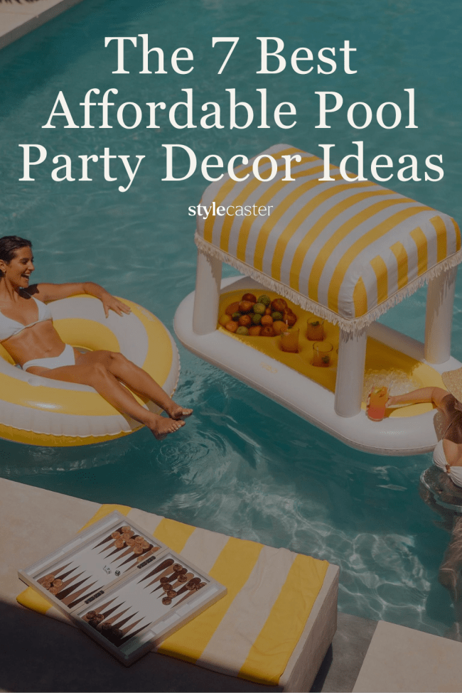 Adding inflatable floating food and drink trays is an easy way to make your pool party feel like a vacation getaway. “Bring that vacation mode feel with inflatable floating food and drink trays. “Guests love this, as it adds color and goodies so they don’t need to leave the pool,” Jervis-Hill adds. “Fun elements such as parasol straws and cabana stripe pool towels matching your theme can also add some fun to your decor.”