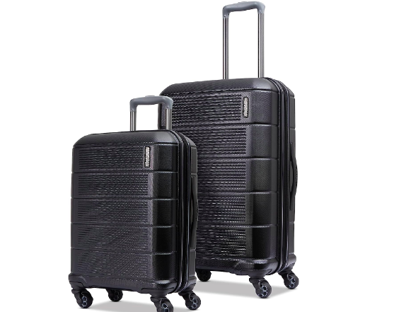 This two-piece set includes one carry-on sized luggage piece and another medium sized for checked baggage. The smaller one fits inside the larger one for easy storage.