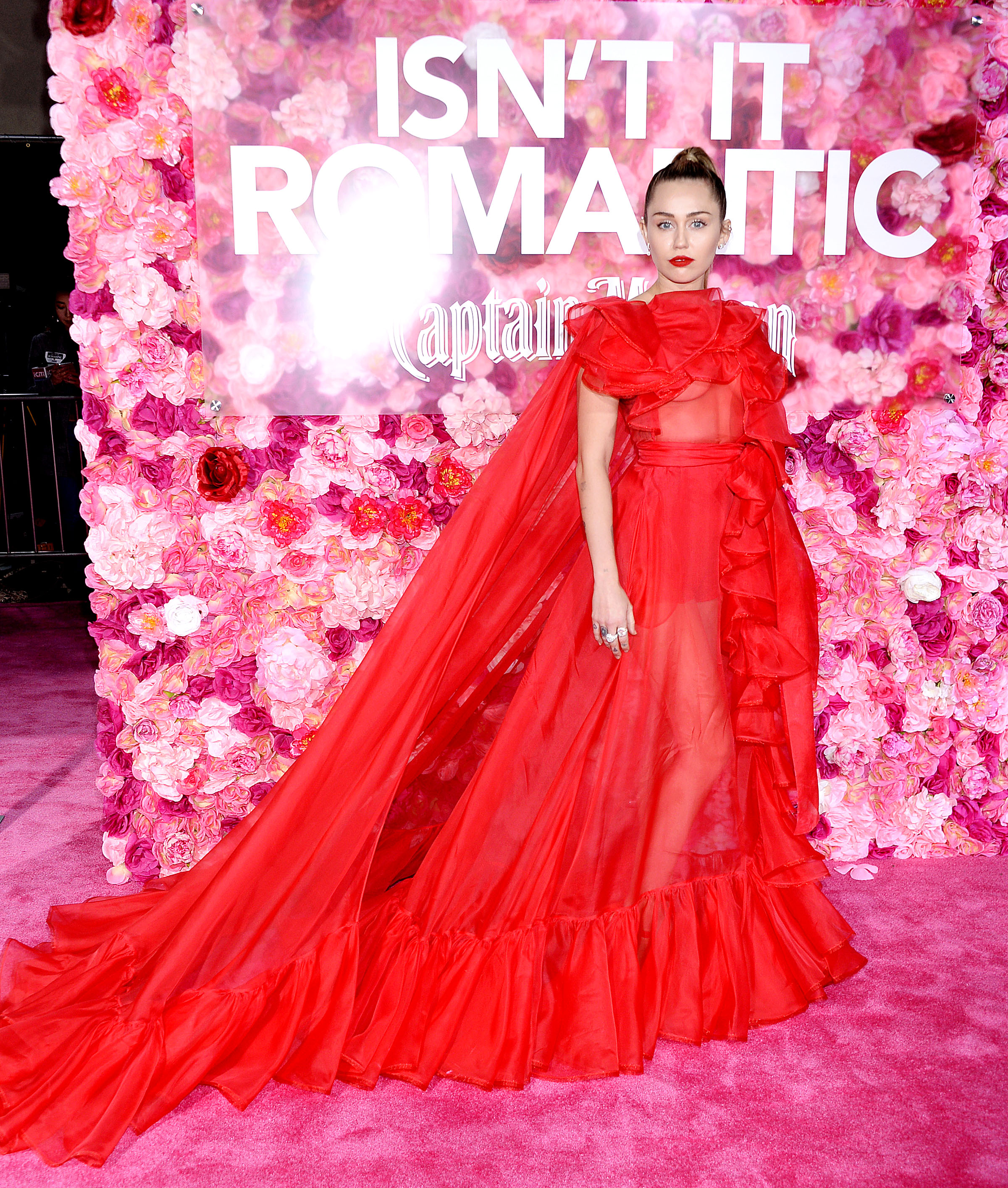 The drama and romance of Cyrus’ outfit was a bit ironic, considering the plot of the new film. If you keep romantic comedies at all on your radar, you’ll know that Rebel Wilson stars alongside Liam Hemsworth in Isn’t it Romantic—a film about a woman who doesn’t believe in romance until she hits her head and wakes up inside a cheesy romantic comedy. Cyrus really went full rom com with her outfit, proving, unlike Rebel Wilson’s character, she’s just a huge romantic. (I mean, if you’re married to Liam Hemsworth, how could you not be?)