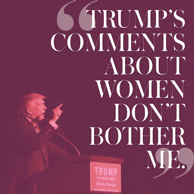 So we decided to ask some. Especially in the midst of polls showing Hillary Clinton beating Trump by a narrow margin with women (54% currently plan to vote for HRC), we felt the need to understand the mind-sets of ladies—especially young ones—who aren’t bothered by what many people consider to be Trump’s displays of egregious sexism and flagrant bigotry.